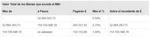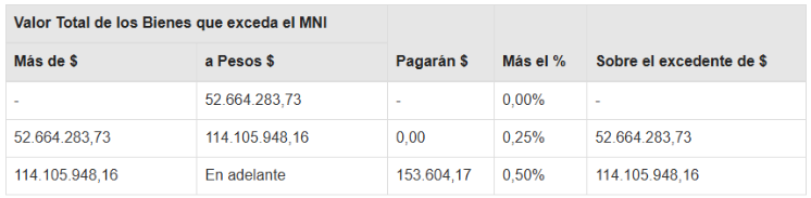 El gravamen a ingresar será el que resulte de aplicar, sobre el valor total de los bienes situados en el país y en el exterior sujetos al impuesto, excepto las acciones y participaciones que deban ser declaradas por las personas jurídicas en carácter de responsables sustitutos, que exceda de $ 384.728.044,57, la siguiente escala: